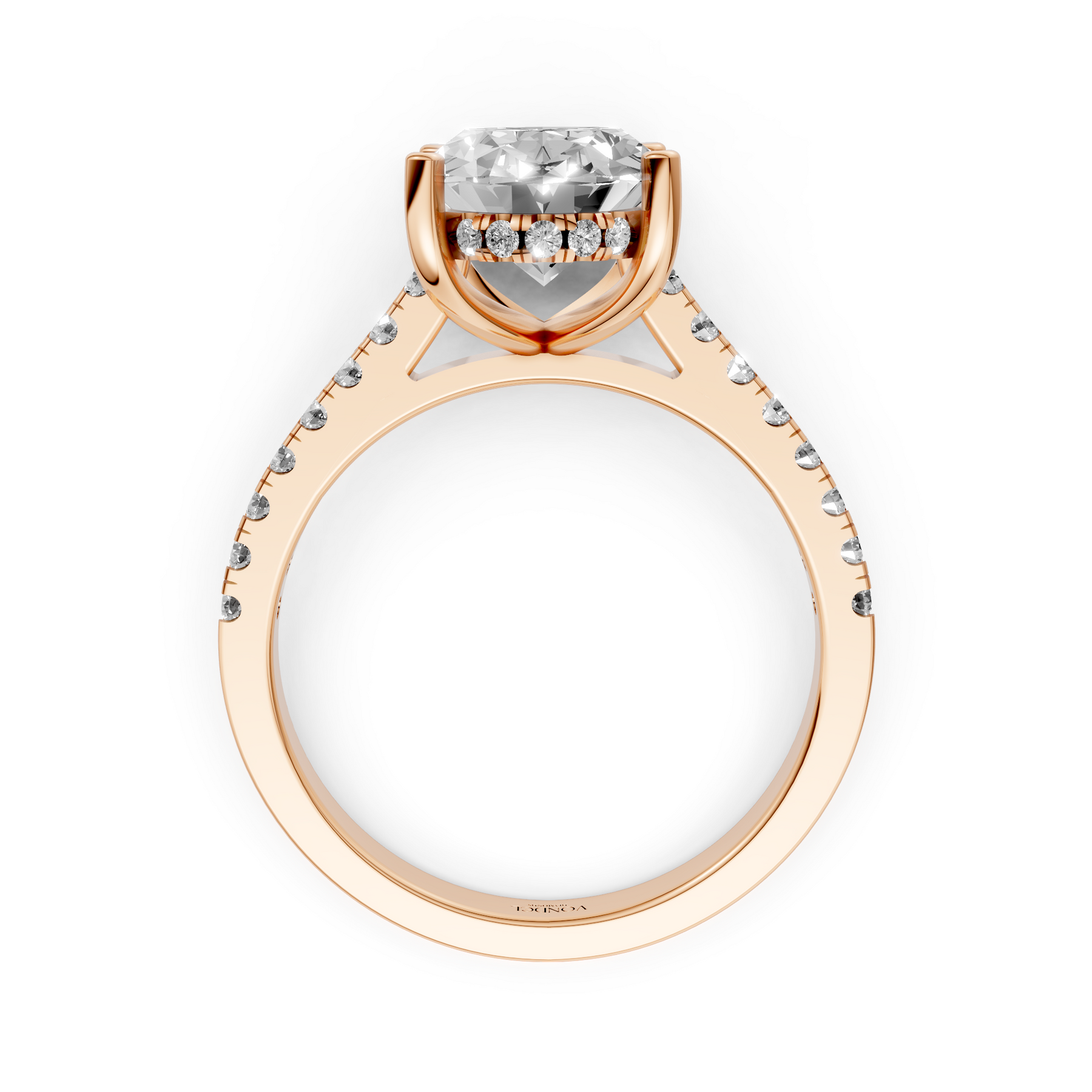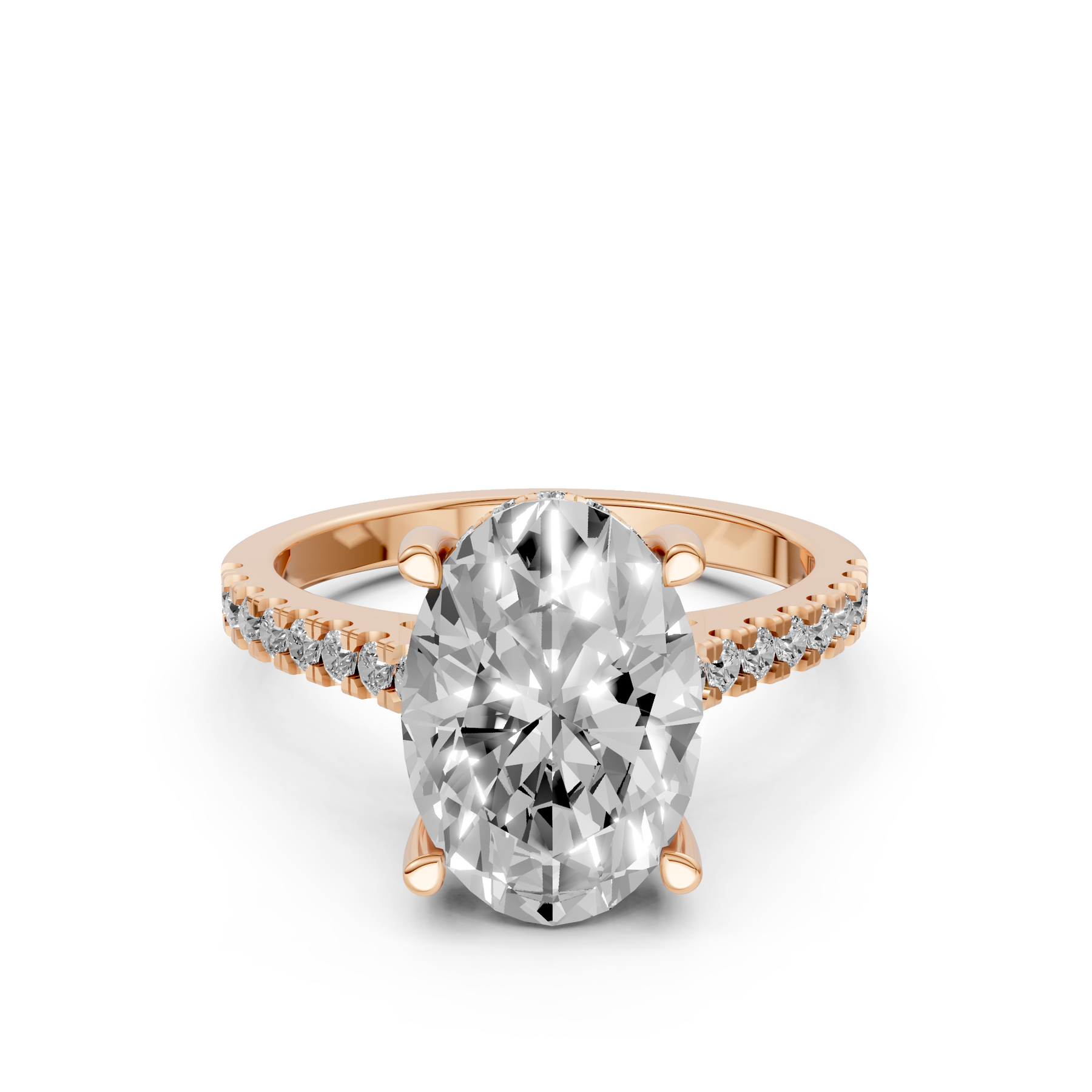 De Oval Solitaire Ring is een iconische verlovingsring die grootsheid en verfijning combineert. De indrukwekkende ovale middensteen van 3,00 ct schittert in een elegante 4-poot zetting. Een subtiele hidden halo onder de steen zorgt voor extra fonkeling bij elke beweging, terwijl de pavé-gezette band de ring een luxueuze en verfijnde uitstraling geeft.
