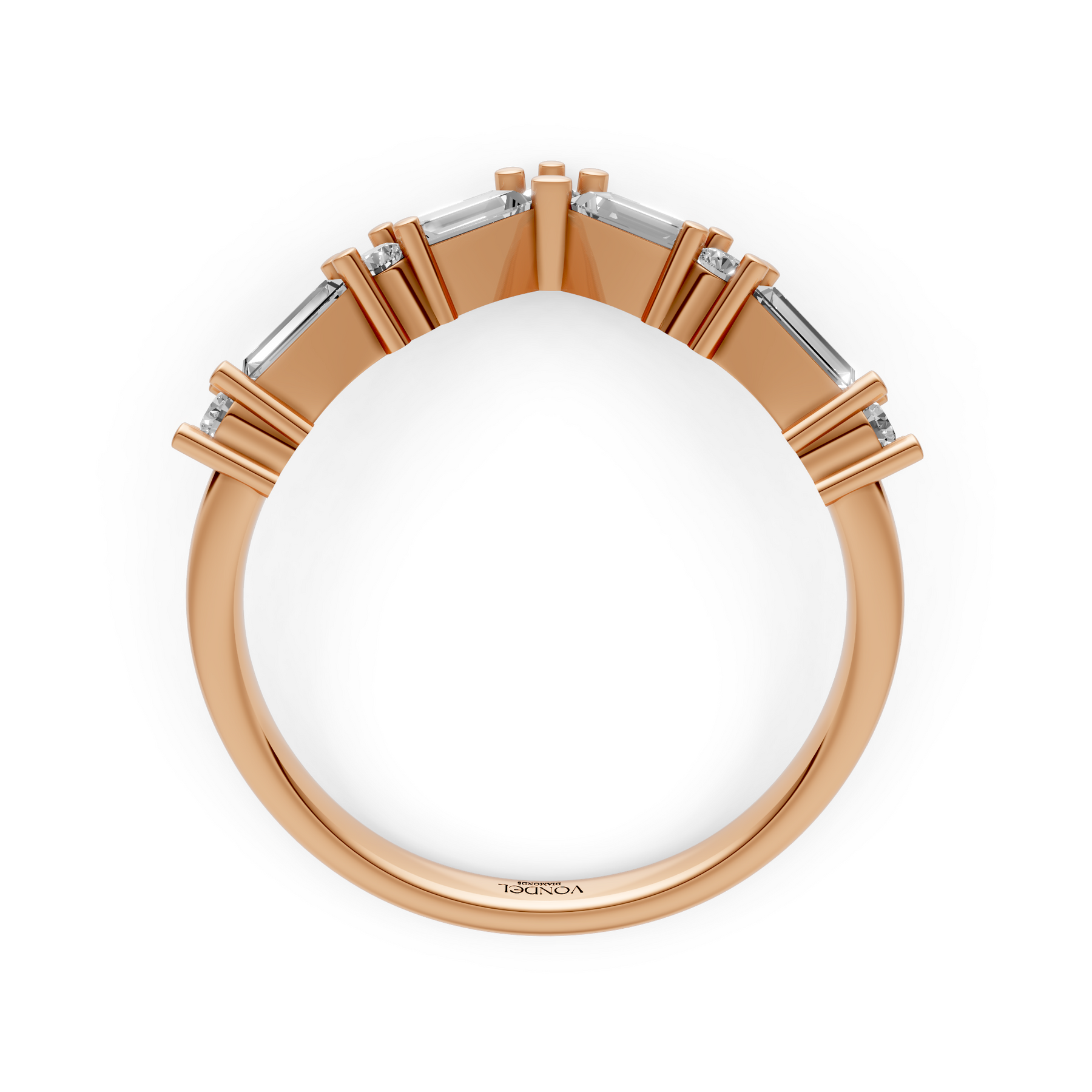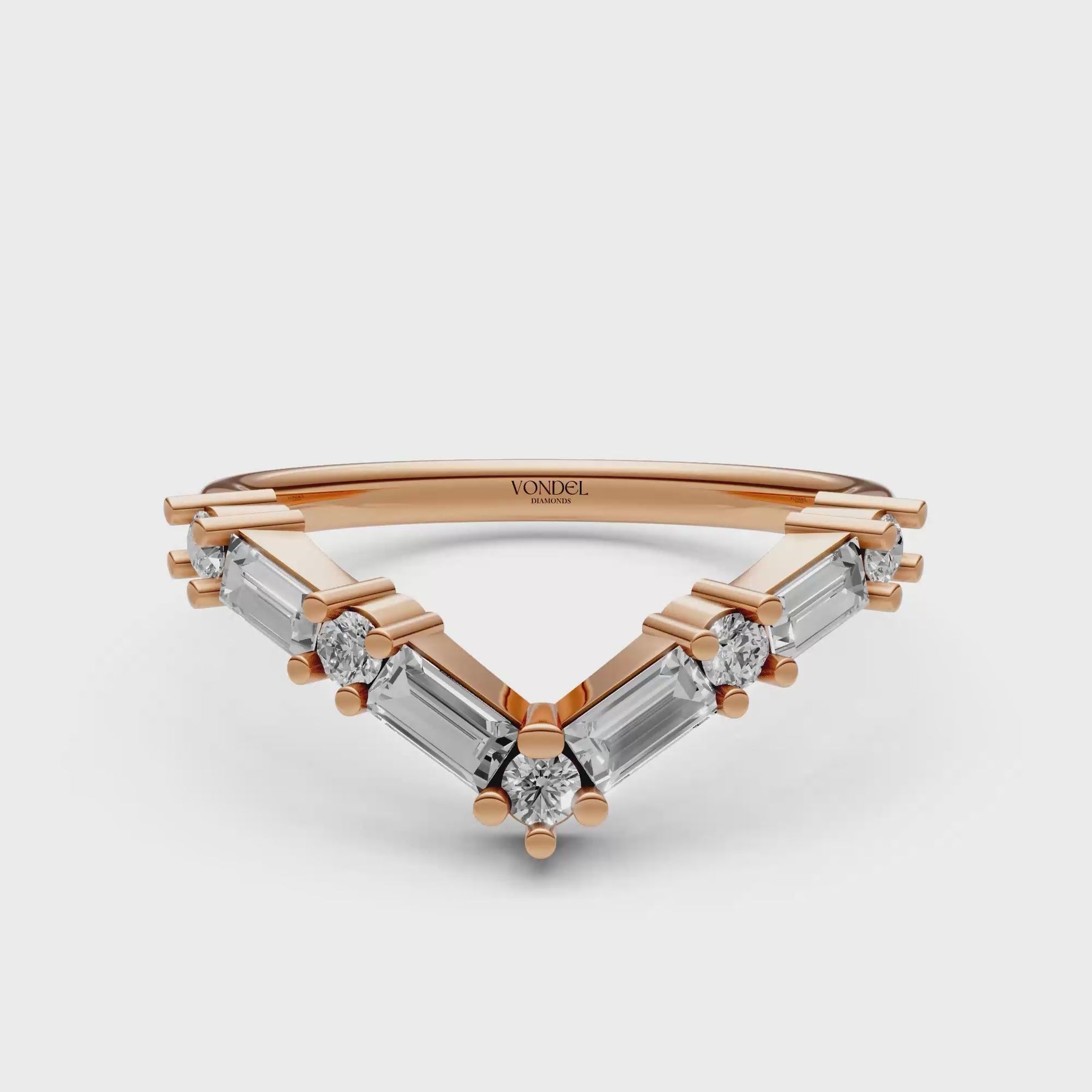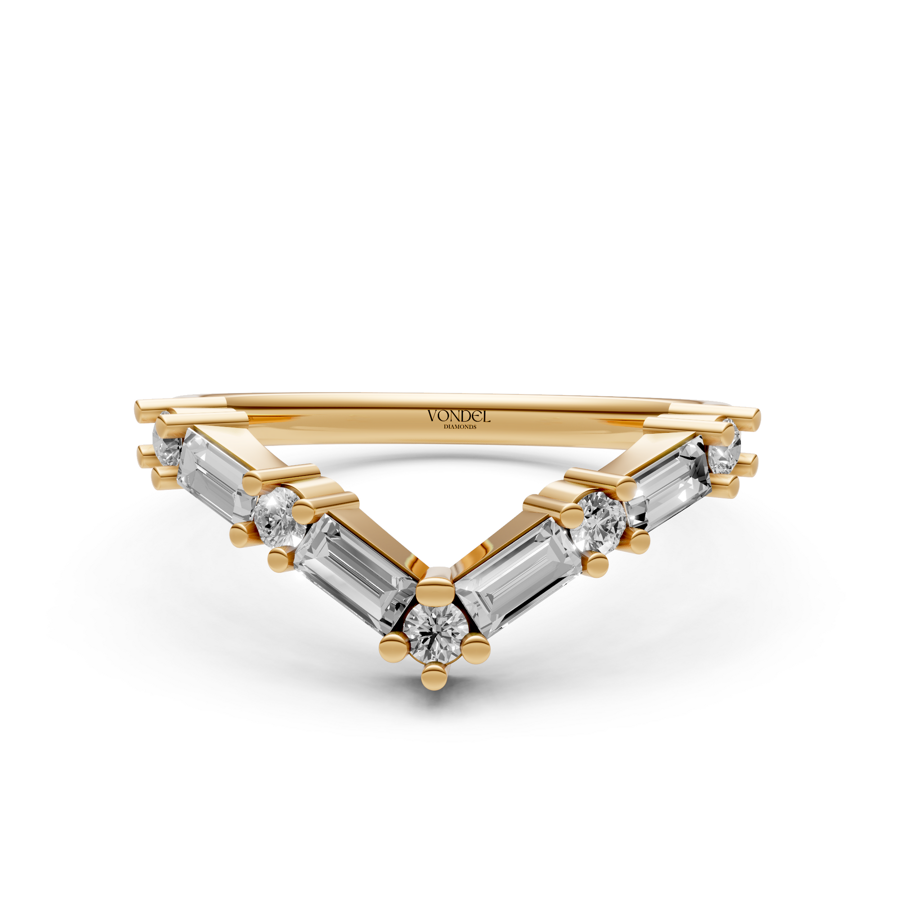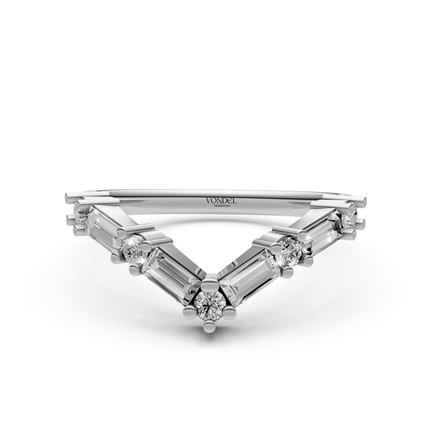 De V-Shape Baguette Ring combineert geometrische elegantie met een moderne uitstraling. Het verfijnde V-vormige ontwerp is gezet met afwisselend baguette en ronde briljant geslepen diamanten, die samen een opvallend lijnenspel creëren. Perfect als trouwring, stackable band of als stijlvol accent naast een solitaire of halo verlovingsring.