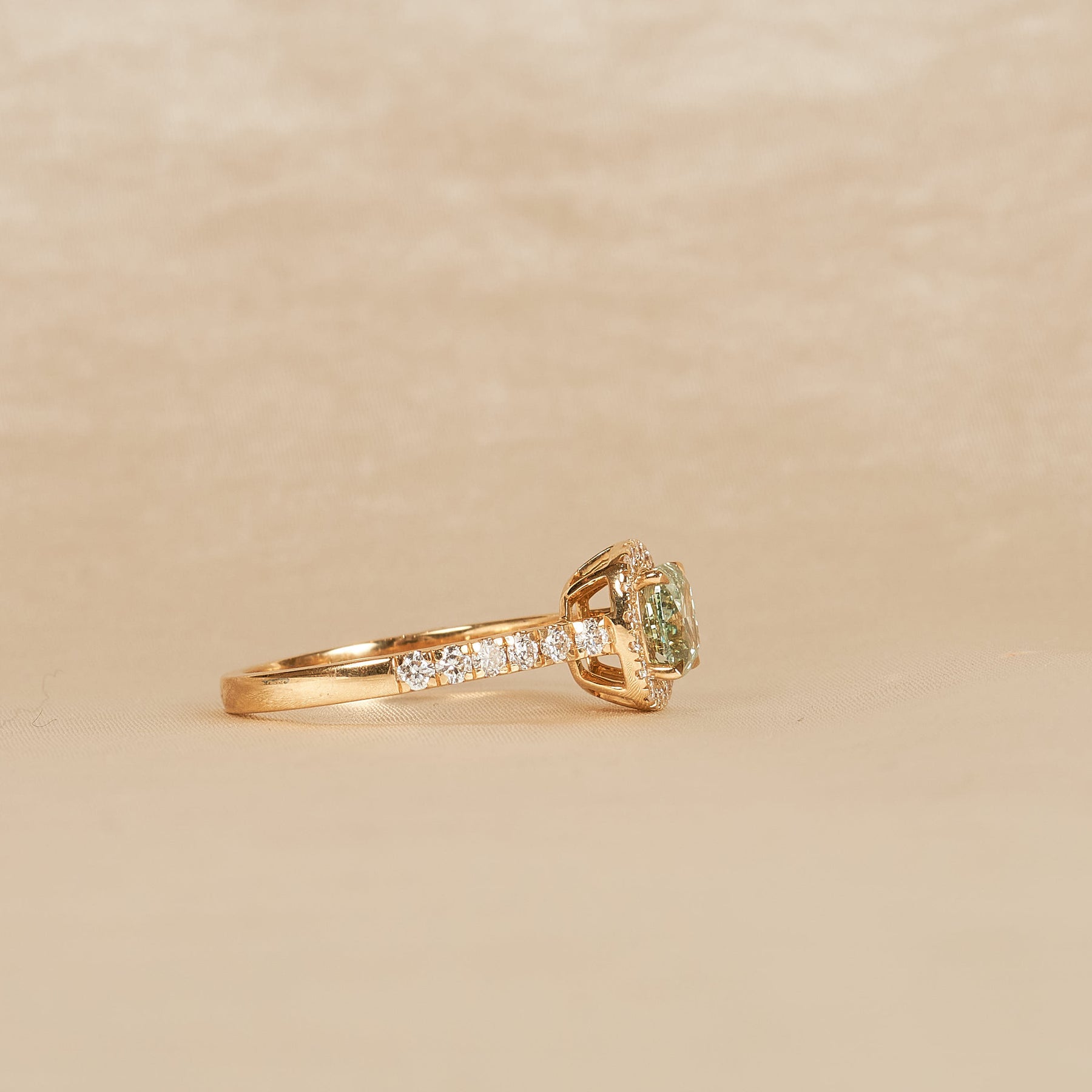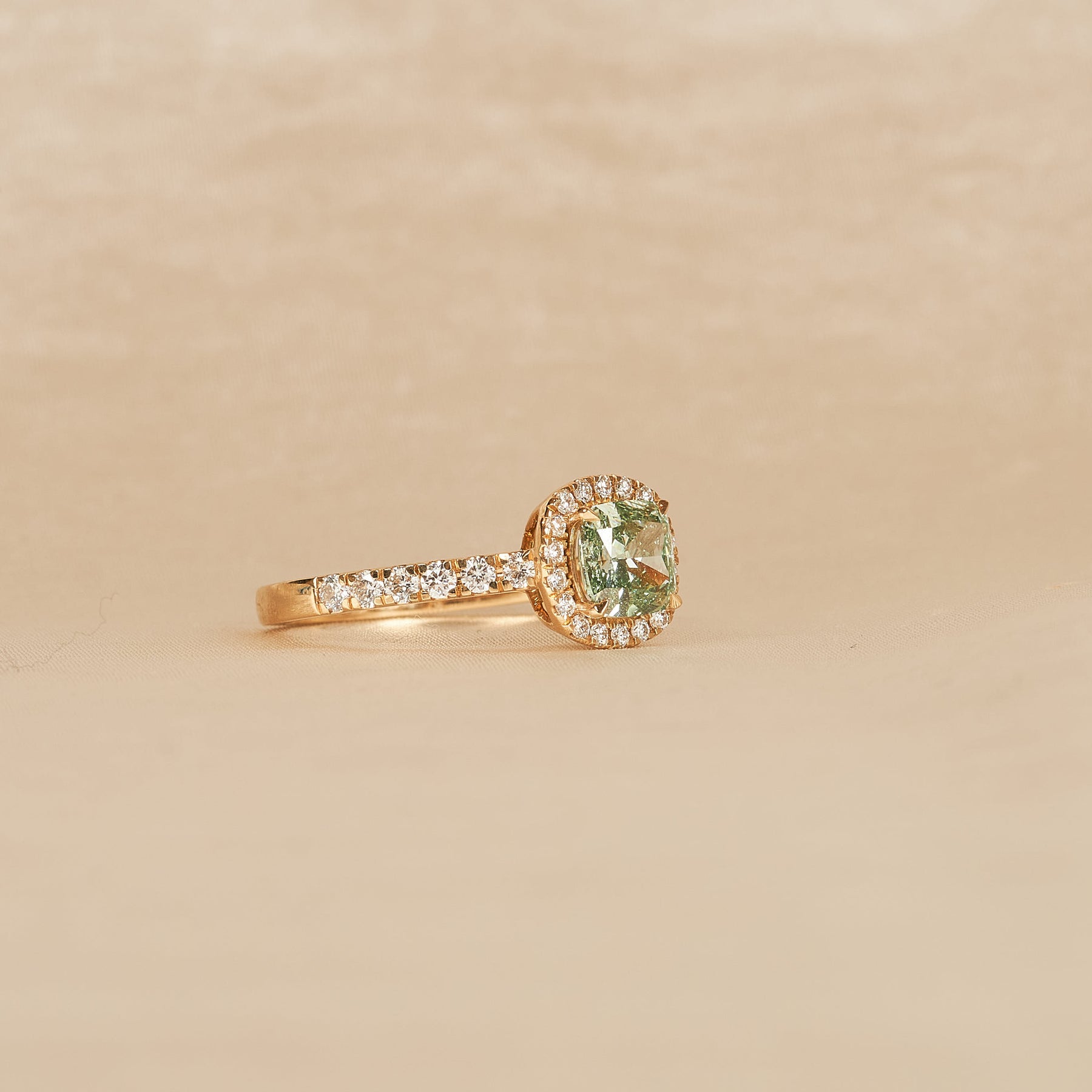 Cushion Halo Ring met Pavé-band en Groene Diamant – 1,42 ct