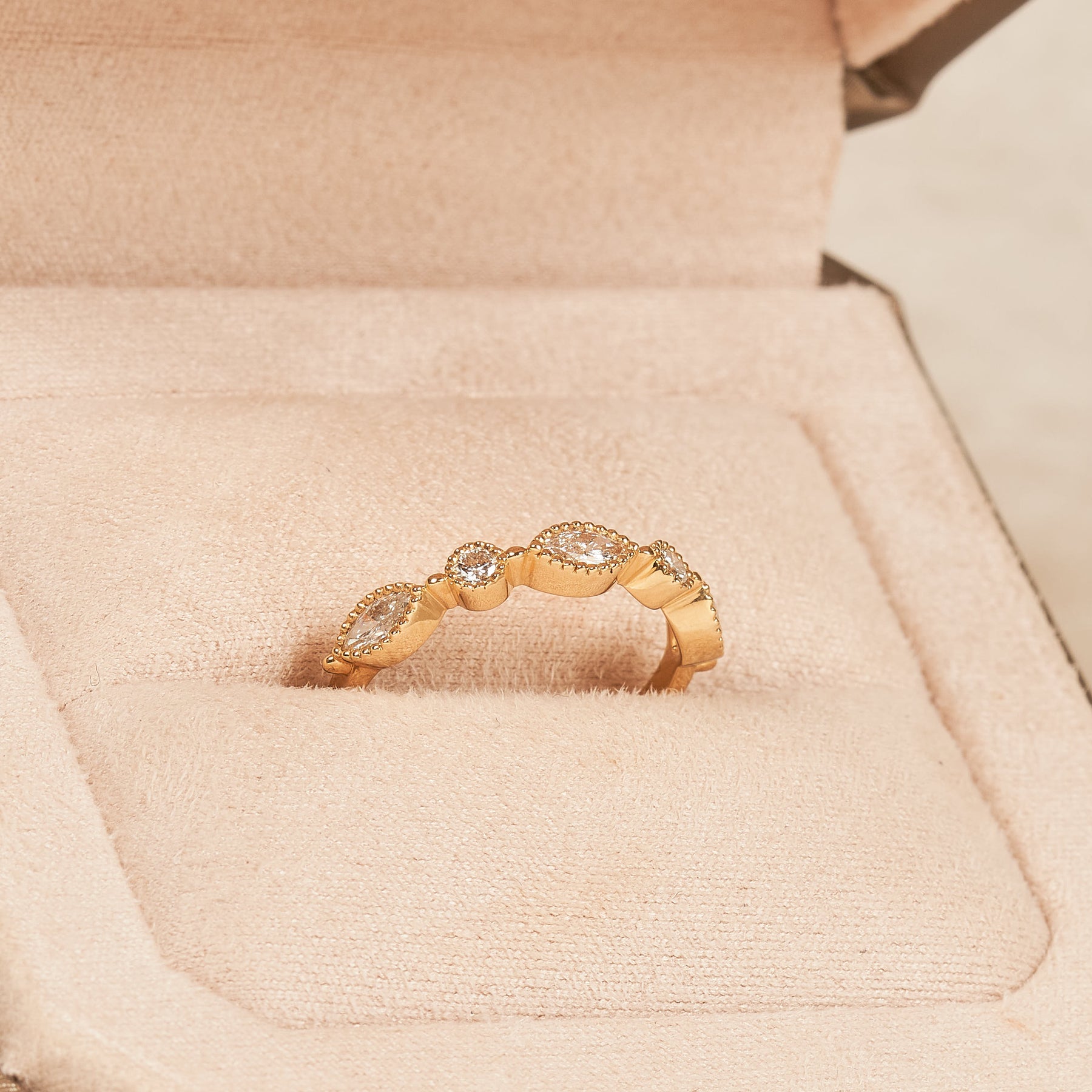 De Marquise Rond Briljant Rijring in vintagestijl is een verfijnde en romantische creatie die tijdloze elegantie uitstraalt. Afwisselend marquise- en rondgeslepen diamanten worden omlijst door een delicate bolletjesrand (milgrain), die elke steen een zachte, vintage uitstraling geeft. De subtiele schittering en speelse vormwisseling maken deze ring tot een echte blikvanger, zonder haar ingetogen charme te verliezen.