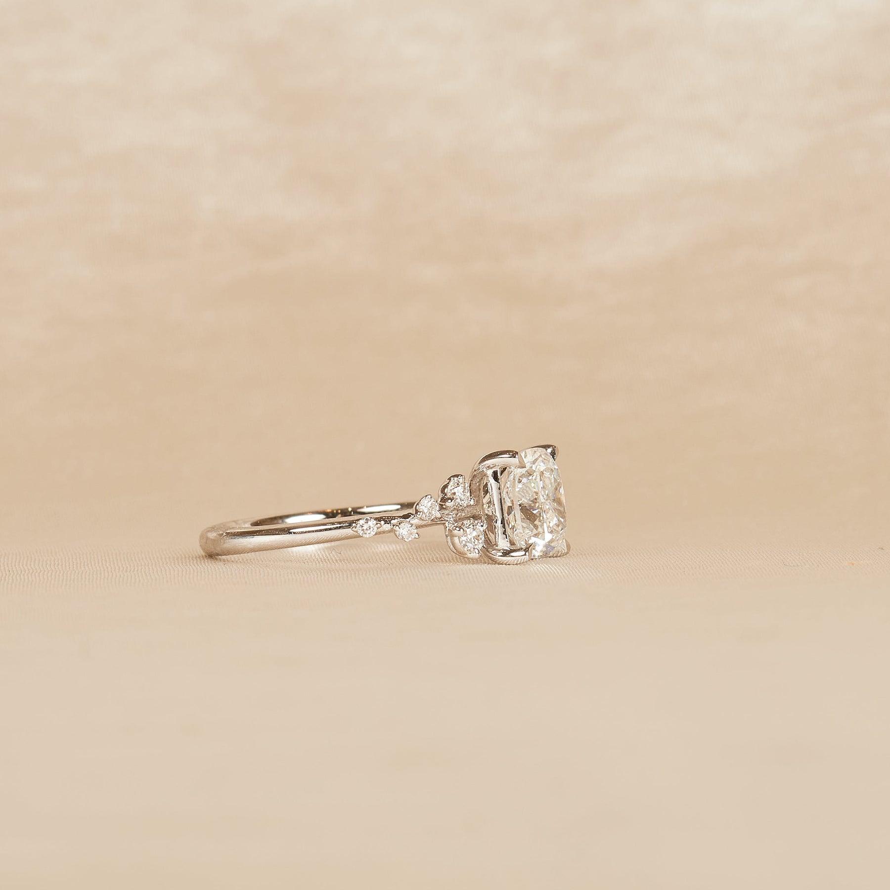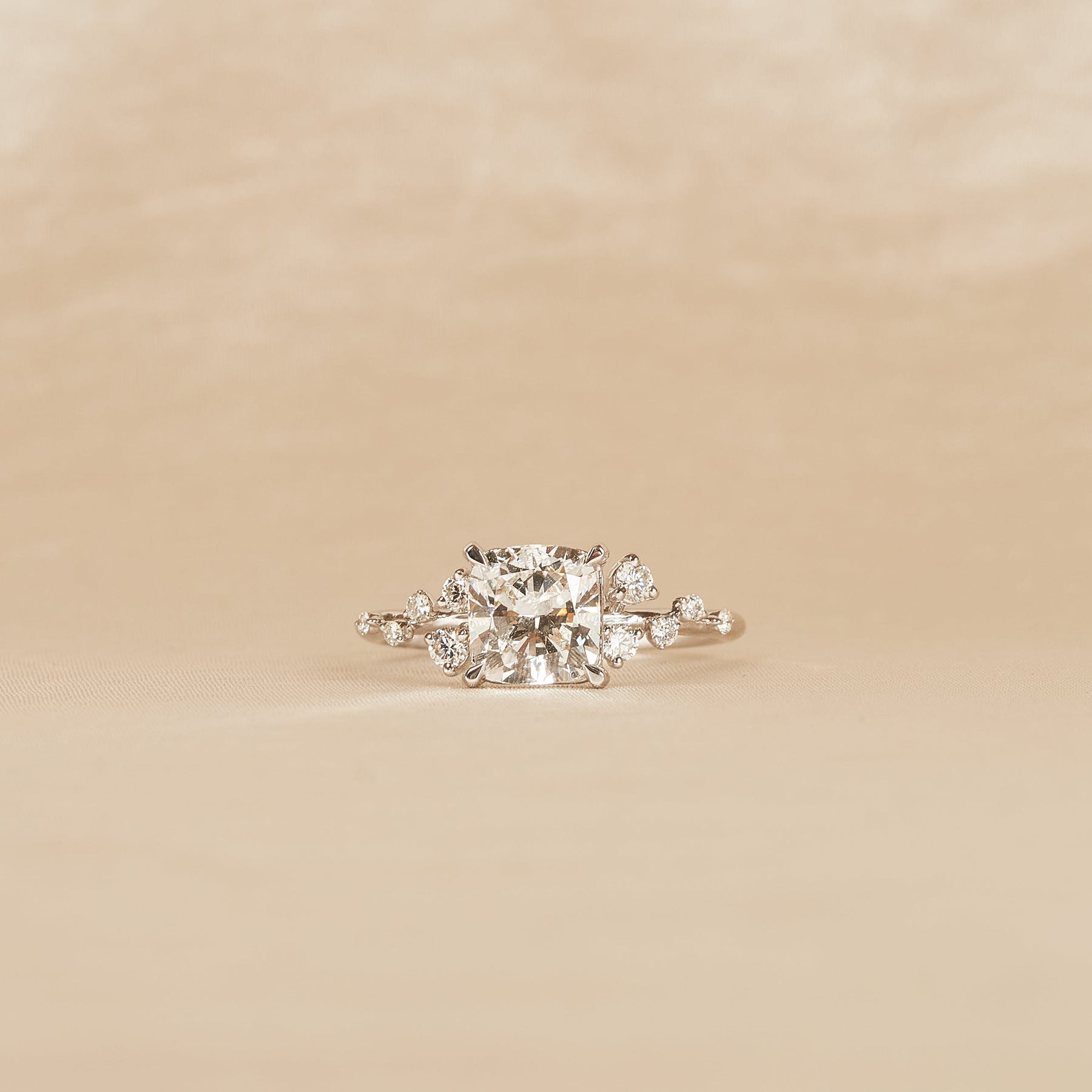 De Cushion Cut Diamond Snowdrift Ring is een betoverende en luxueuze creatie die de klassieke kussenslijpvorm combineert met een fonkelende, met diamanten bezette band. Het ontwerp straalt zowel elegantie als moderne verfijning uit, waarbij de zachte lijnen van de cushion cut alle nadruk leggen op de schittering en helderheid van de middensteen. De pavé gezette diamanten langs de band zorgen voor een extra sneeuwvlok-achtige glinstering – alsof de ring bedekt is met een subtiel laagje sprankelend ijs.