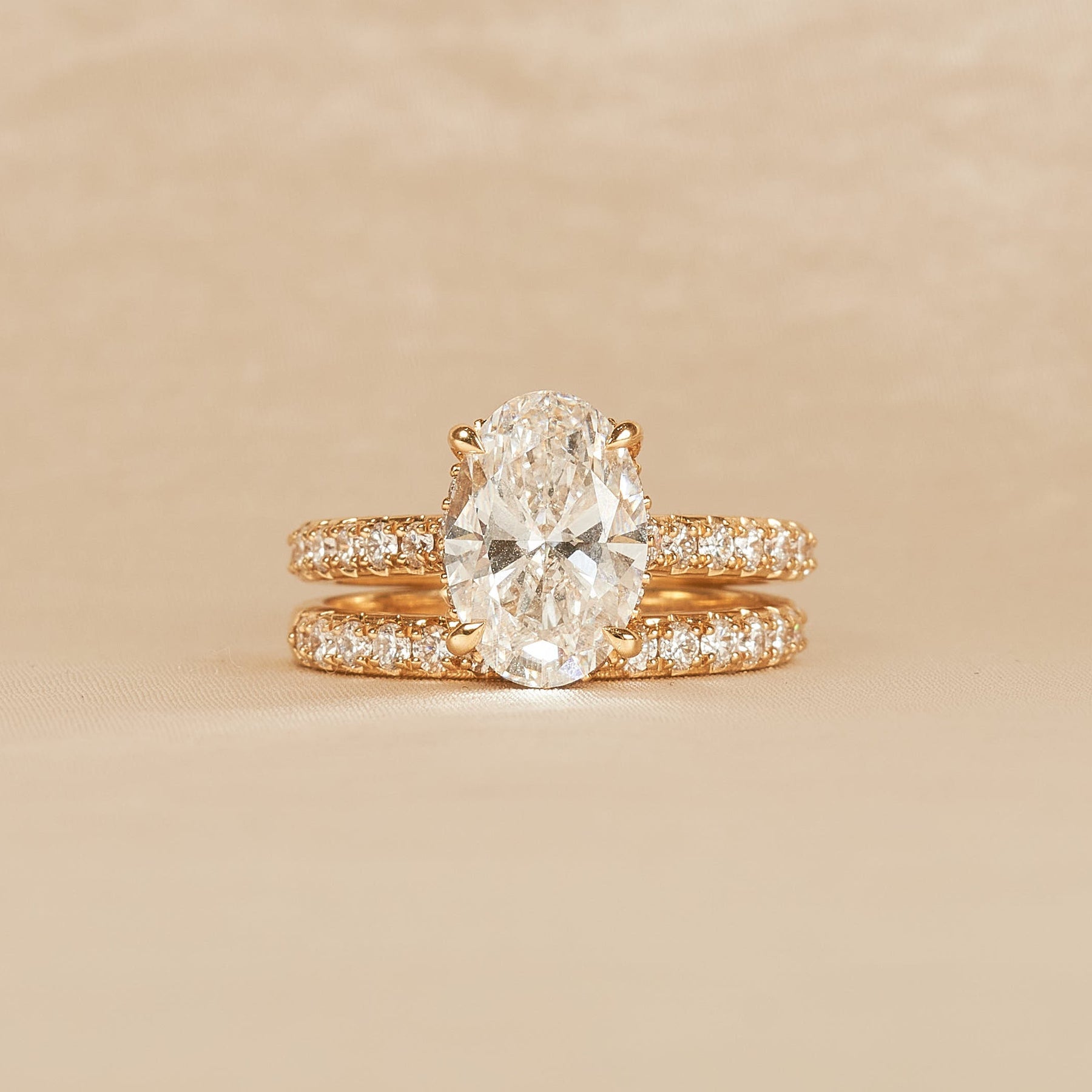 De Oval Solitaire Pavé Ring met bijpassende pavé band is een verfijnde en luxueuze interpretatie van de klassieke verlovingsring. Het ontwerp combineert een schitterende ovale lab grown diamant als middensteen met een elegante pavé-zetting langs de band, waardoor een prachtig fonkelend geheel ontstaat. De ovale vorm verlengt optisch de vinger en legt alle nadruk op de schittering en helderheid van de steen, terwijl de pavé band extra sprankeling toevoegt.